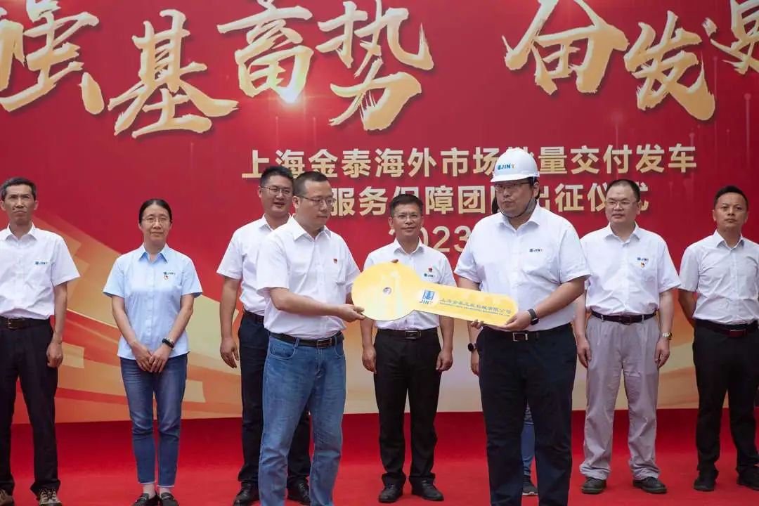 6月20日上午11时,“2023上海金泰海外市场批量交付发车暨服务保障团队出征仪式”于上海安亭洛浦路45号金泰本部隆重举行。一辆辆满载主机、附件和钻具以及现场保障用品备件的卡车从金泰本部驶向港口,奔赴中东、北美、澳洲、南亚、俄罗斯等国家和地区,为上半年的收官工作再敲重锤。上海金泰总经理黎隶万、党委书记陈雪英、董事副总经理徐峰等公司主要领导以及生产、研发、营销等各部门代表共同参加见证。
